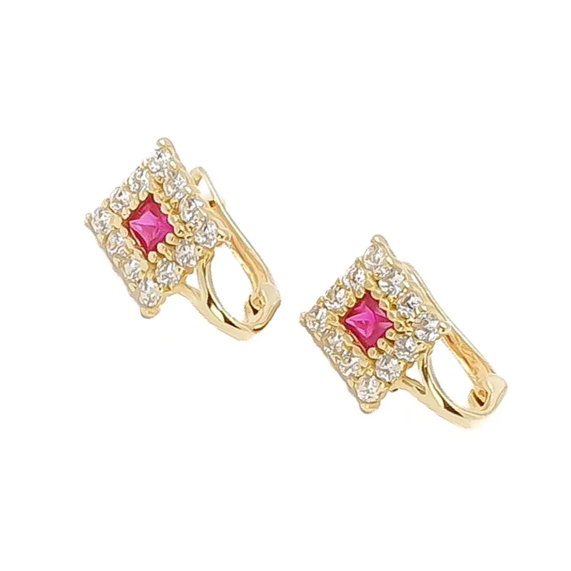 Złote Kolczyki Kwadrat Czerwone i Białe Cyrkonie Angielskie Zapięcie Próba Złota 585