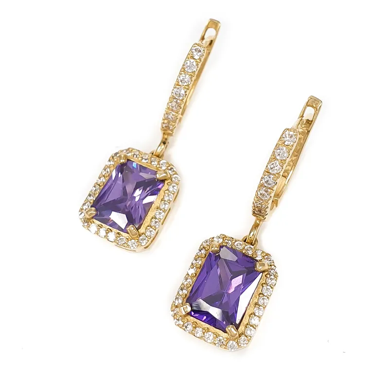 ZŁOTE KOLCZYKI 585 WISZĄCE AMETYST I CYRKONIE