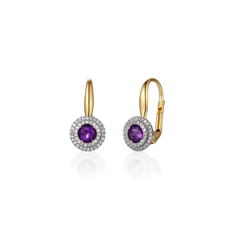 Złote 585 Kolczyki Ametyst Brylanty Patentka ( NA ZAMÓWIENIE )