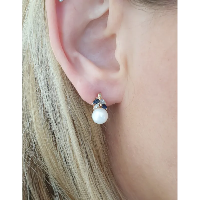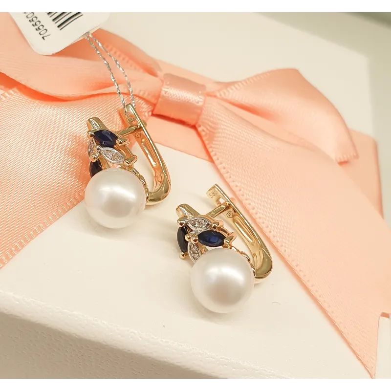 ZŁOTE KOLCZYKI 585 PERŁY SZAFIRY DIAMENTY ( NA ZAMÓWIENIE )