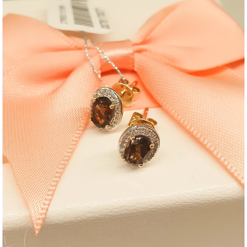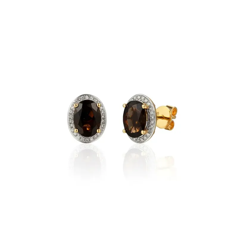 Złote Kolczyki Kwarc Dymny Diamenty Sztyft pr 585