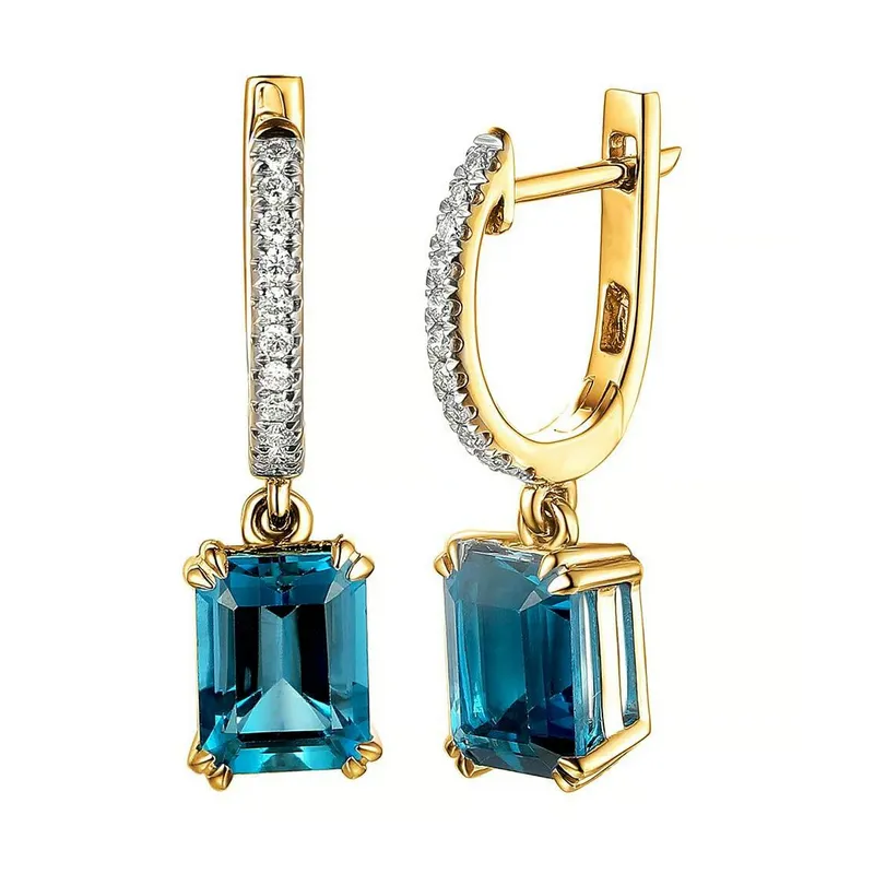 ZŁOTE KOLCZYKI LONDON BLUE TOPAZ I DIAMENTY PRÓBA 585