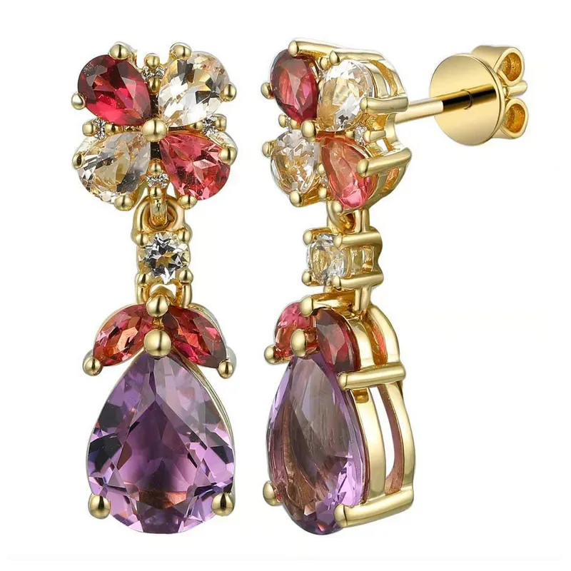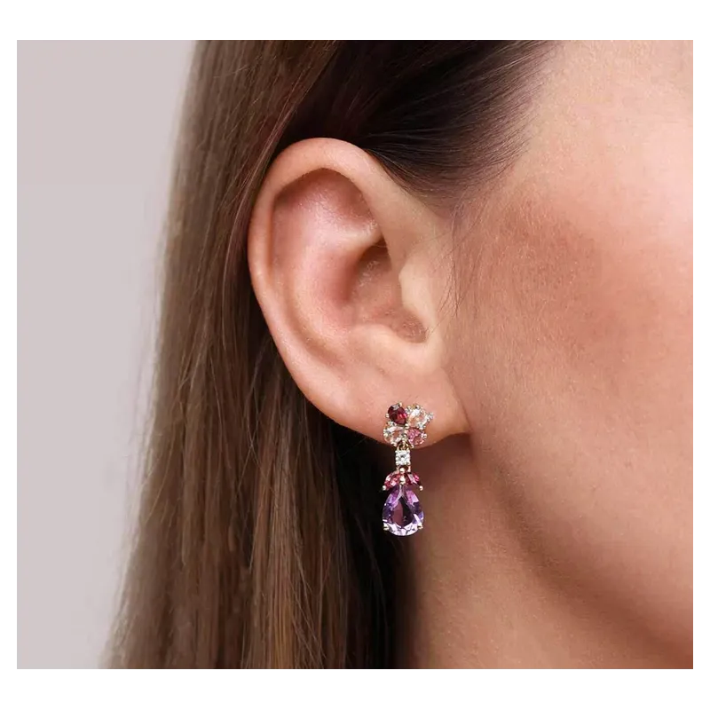 ZŁOTE 585 KOLCZYKI Z AMETYSTAMI RÓŻOWYMI, DIAMENTAMI I KAMIENIAMI KOLOROWYMI