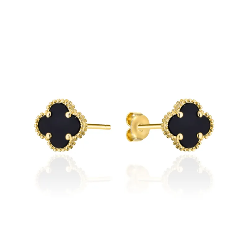 Złote Kolczyki 585 Koniczynki z Onyksem 6,5x6,5mm Super Modny