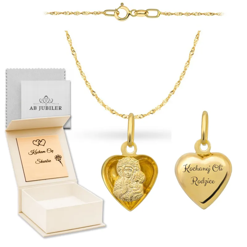 Złoty Medalik 585 Matka Boska z Dzieciątkiem w Serduszku na Chrzest Komunie