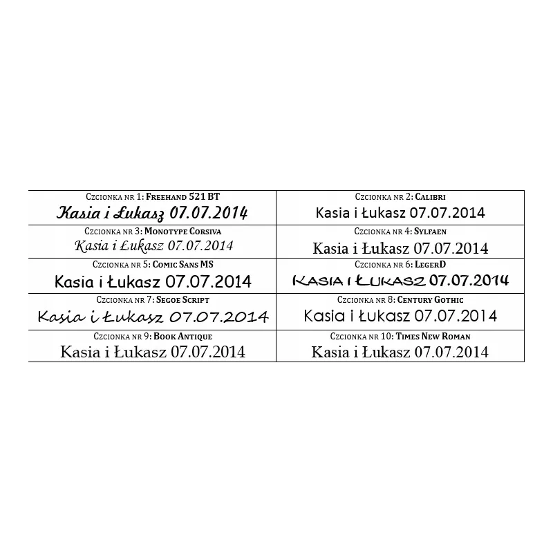 PRZYKŁADOWE DOSTĘPNE CZCIONKI GRAWERUNKÓW (wszystkie szerokości obrączek) - patrz zdjęcie