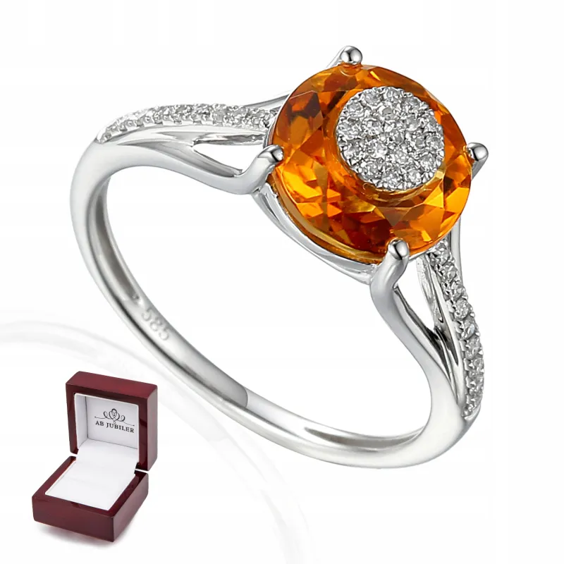 PIERŚCIONEK BIAŁE ZŁOTO 585 CYTRYN DIAMENTY GRAWER