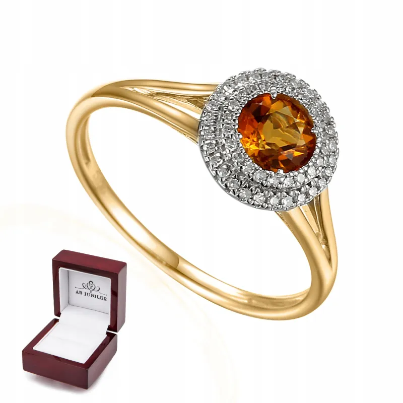 ZŁOTY 585 PIERŚCIONEK CYTRYN DIAMENTY GRAWER