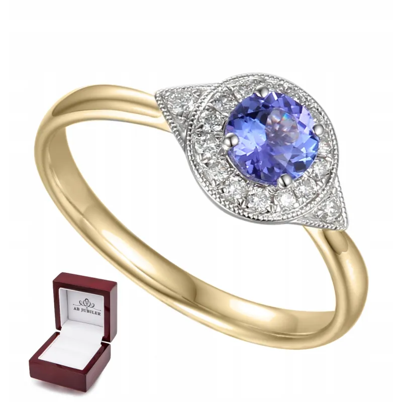 ZŁOTY 585 PIERŚCIONEK TANZANIT DIAMENTY GRAWER ( NA ZAMÓWIENIE )