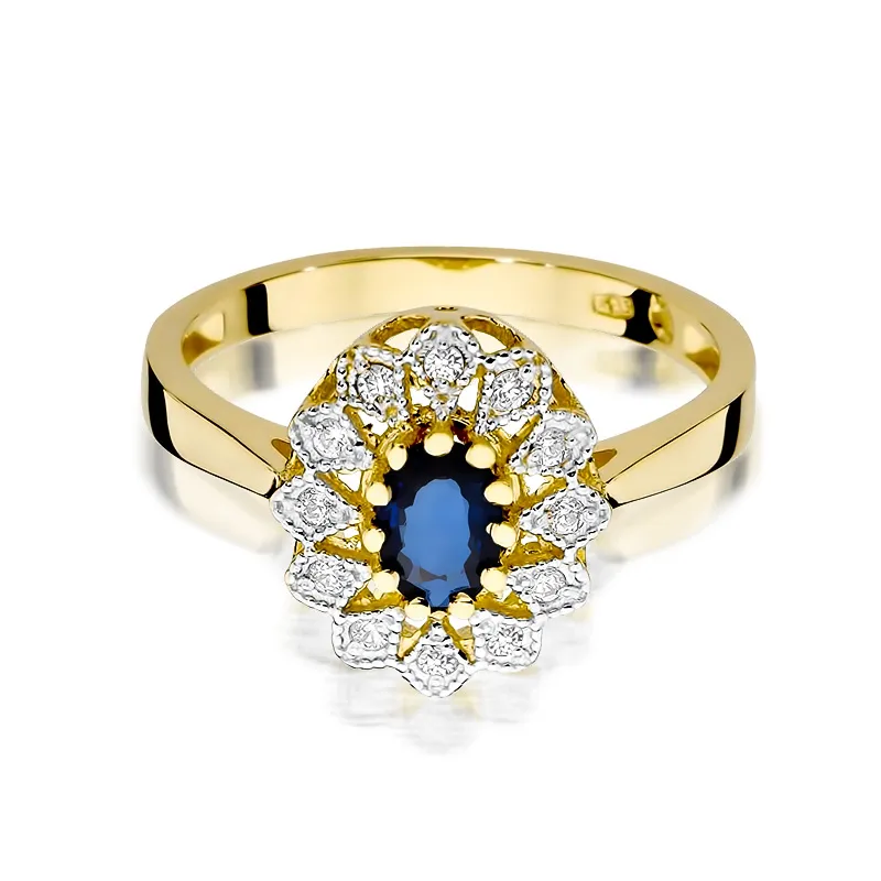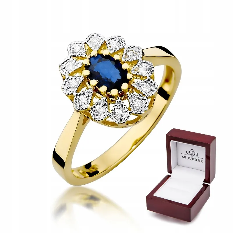 Złoty 14K Pierścionek Szafir Diamenty na Prezent
