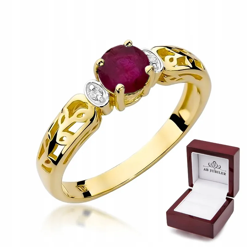 Złoty 14K Pierścionek Zaręczynowy Rubin Brylanty