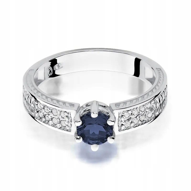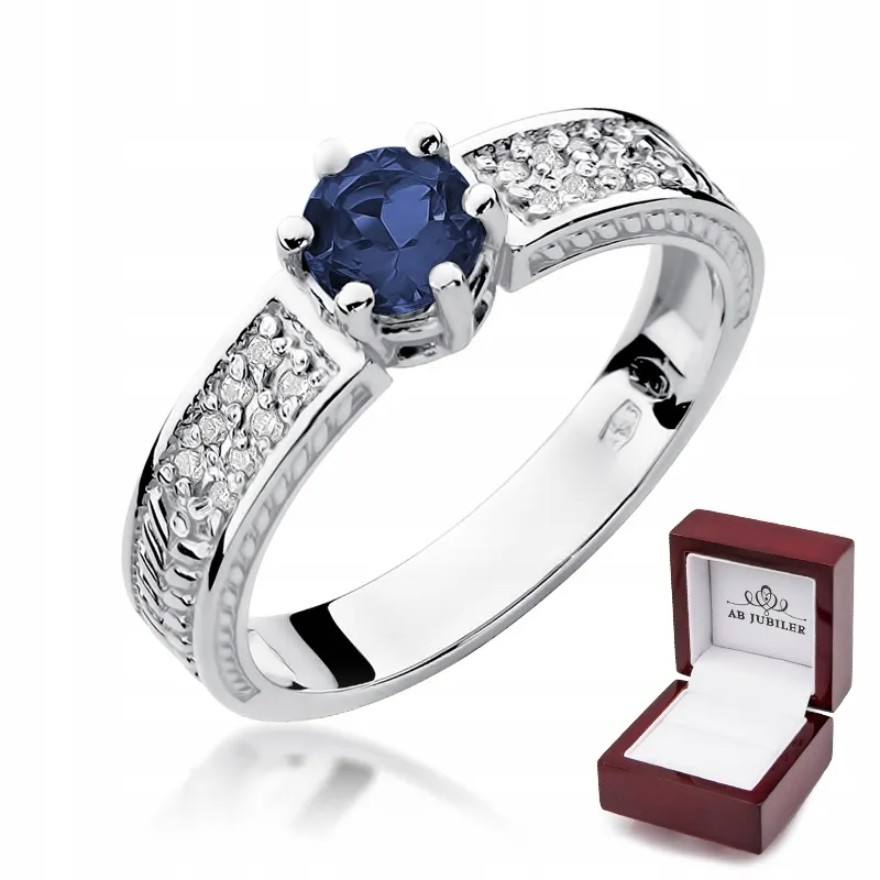 Pierścionek Białe Złoto Szafir i Diamenty Grawer