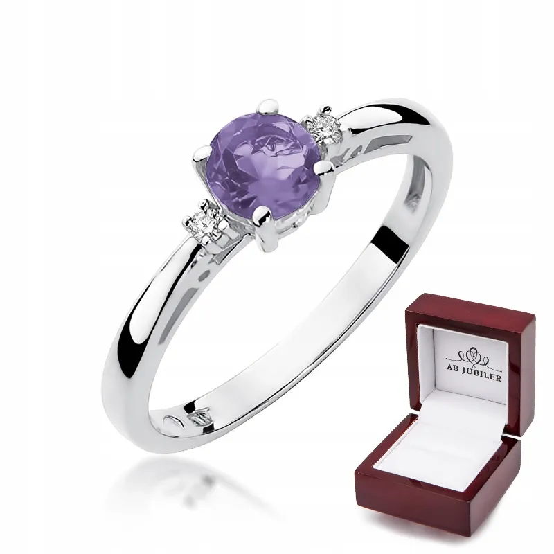 Pierścionek 585 Białe Złoto Ametyst Diament Grawer