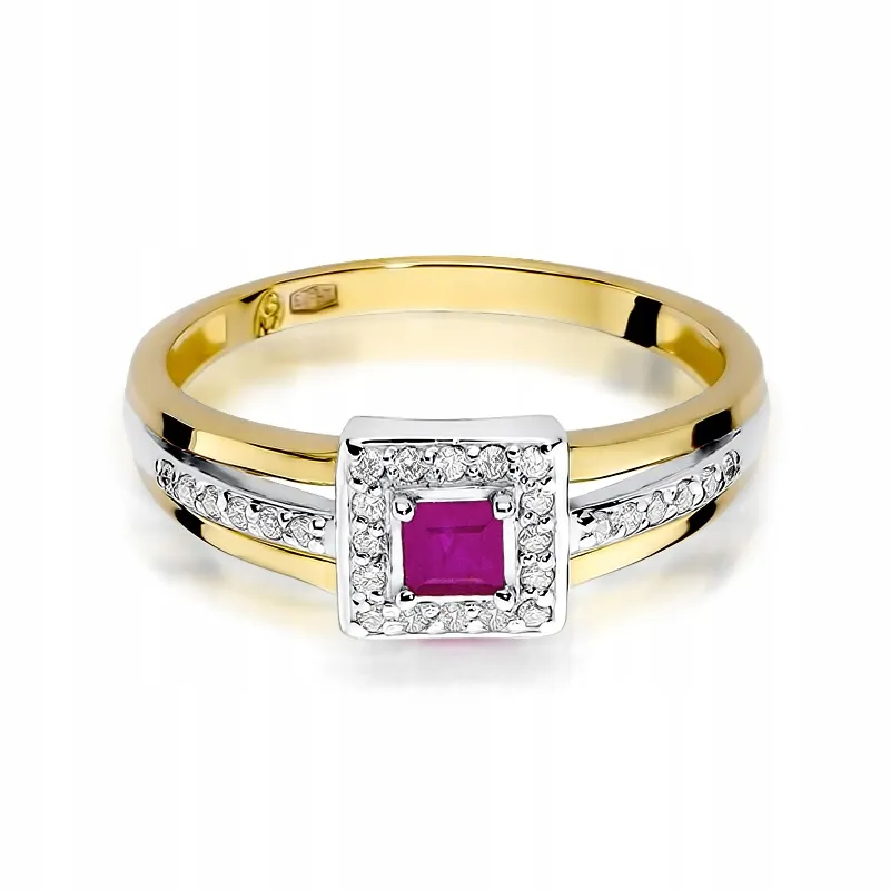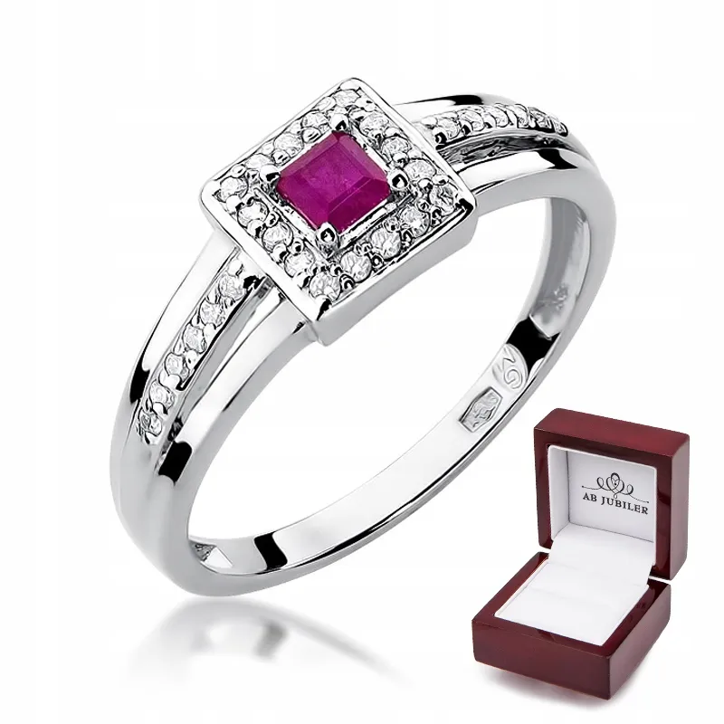 Złoty Pierścionek Rubin z Diamentami w Białym Złocie
