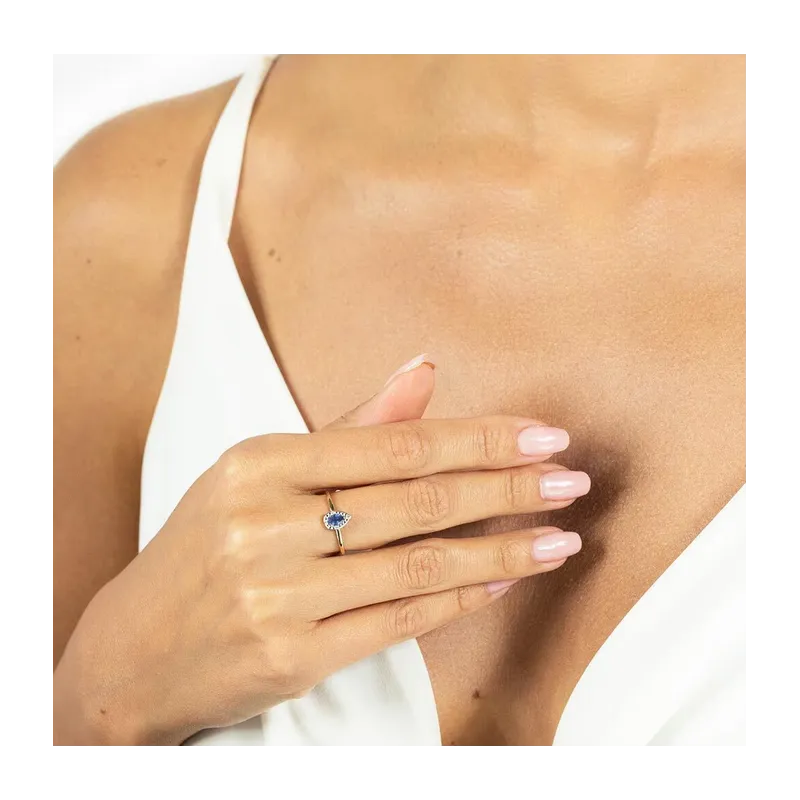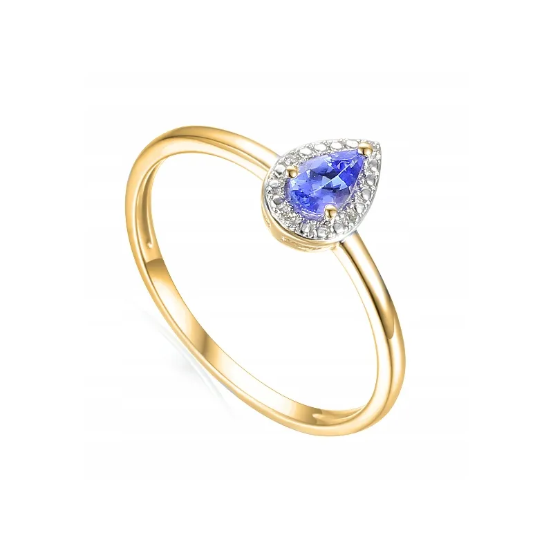 ZŁOTY 585 PIERŚCIONEK ŁEZKA TANZANIT I DIAMENTY
