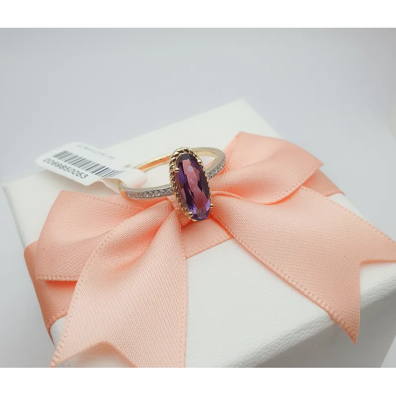Złoty 585 Pierścionek Ametyst i Diamenty Grawer