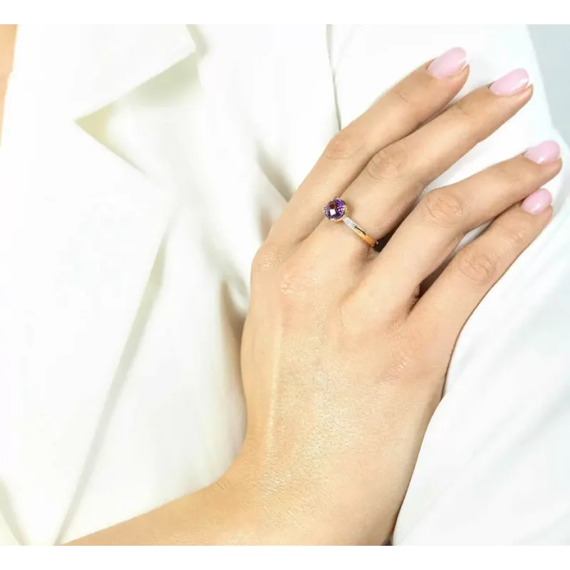 Złoty 585 Pierścionek Ametyst Diamenty